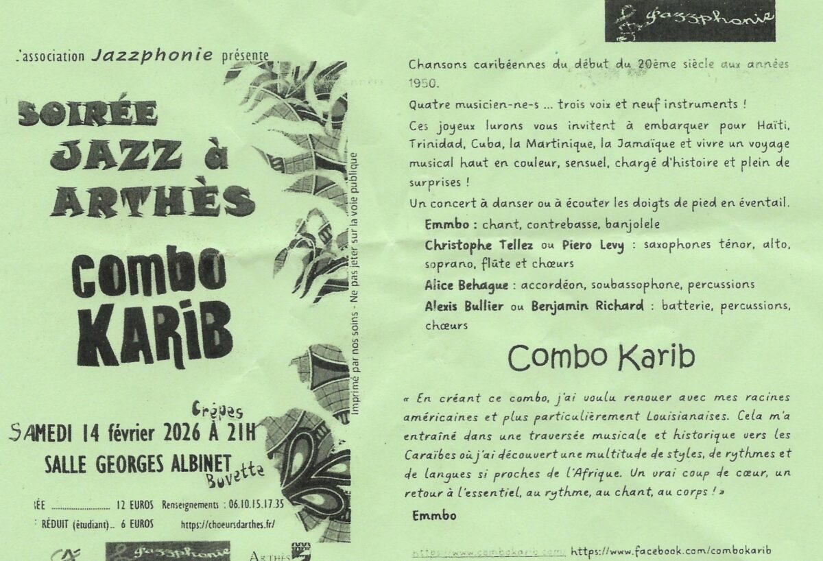 Organisée par l’association JAZZPHONIE Samedi 14 février 2026 à 21 heures à la Salle Georges Albinet- Groupe de 4 musiciens « COMBO KARIB » Buvette- crêpes- entrée 12 €
